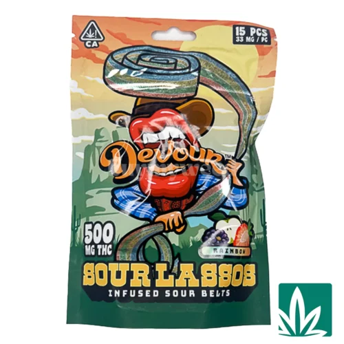 Devour Edibles (500mg) – Sour Lassos – Rainbow delivers a tangy and colorful cannabis experience in cannabis edibles, perfect for those looking for a potent and flavorful high.